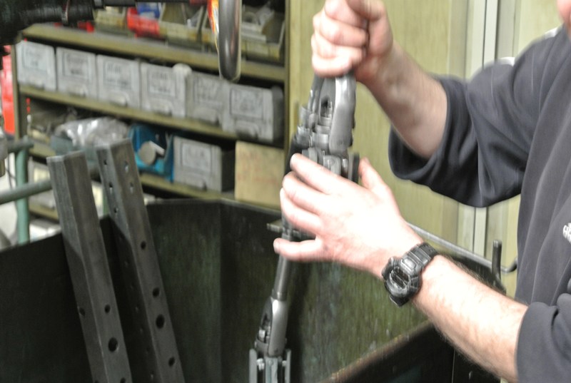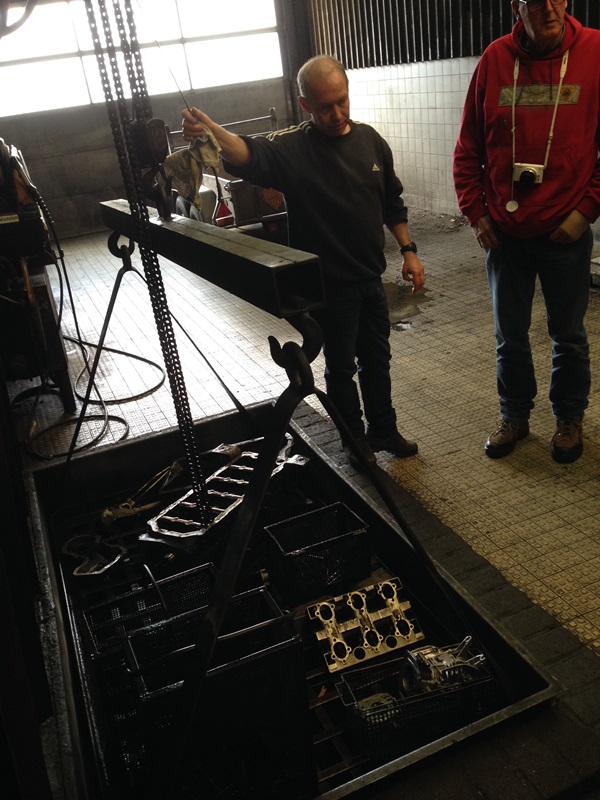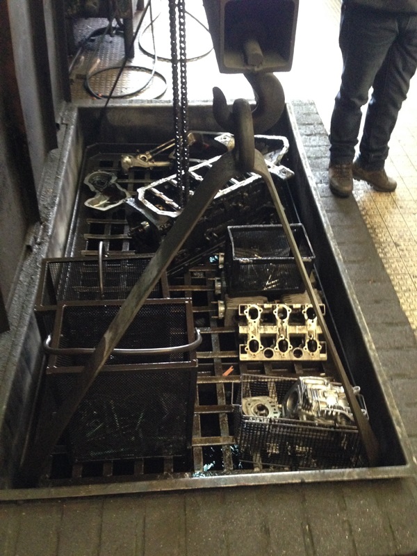 De werkplaats zag er indrukwekkend uit. Daar zag je al gelijk motoren staan van 2/3 kuub in omvang tot hele kleintjes. De een gedemonteerd op een pallet de ander als reserve opgesteld, geschilderd en wel, op een pallet. Eerst naar de wasbak waar de motor gedemonteerd gezuiverd wordt, afhankelijk van de verzadiging van het water blijft het blok hier een tijdje in liggen totdat alle olie maar ook verf verwijderd is. Vervolgens naar een bak waar de cilinderkop wordt afgeperst om te kijken of ergens een scheur/lekkage zit. Alle kanalen dicht gemaakt die dicht moeten zijn en onder druk van een halve bar is idd al te zijn dat deze kop niet goed meer is. Om de situatie zo goed mogelijk te simuleren is het water op een temperatuur gebracht van 92 graden. Jammer maar helaas, deze kop kan als ijzer worden beschouwd. Ge legt ons uit dat een kop in de meest gevallen niet te lassen is!!