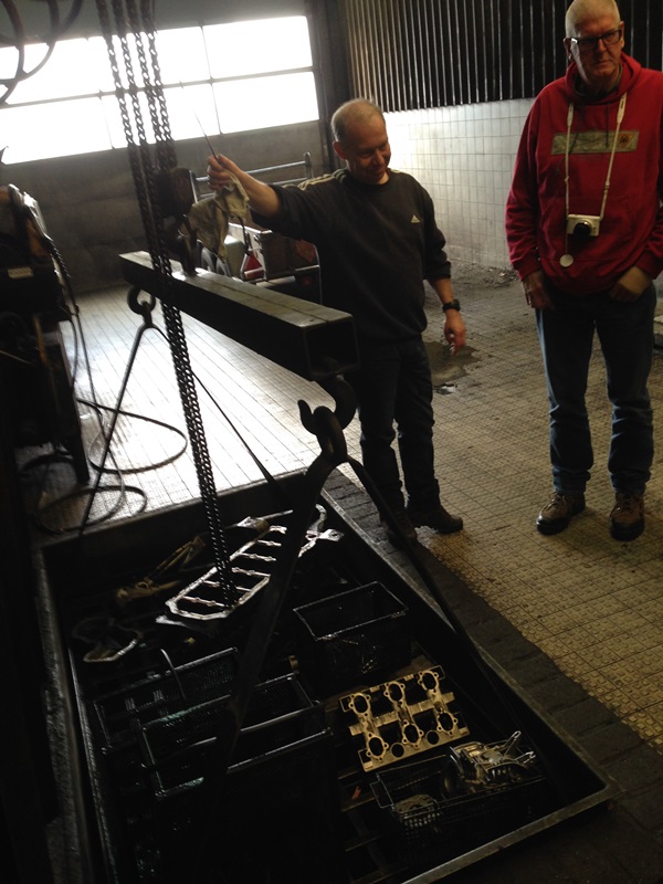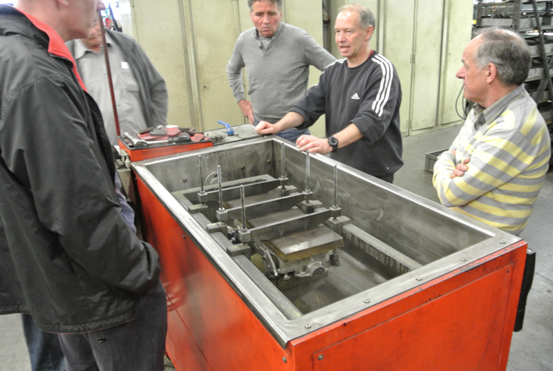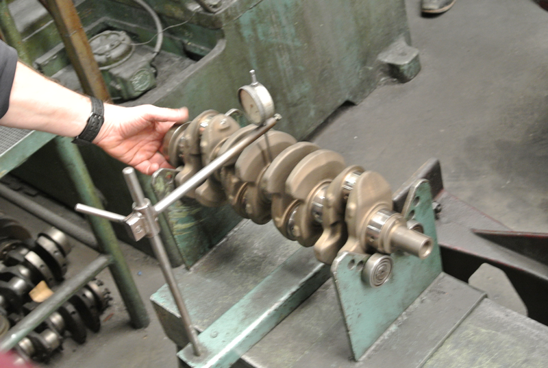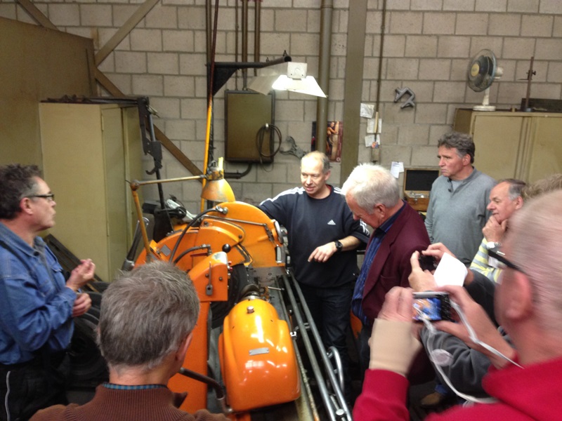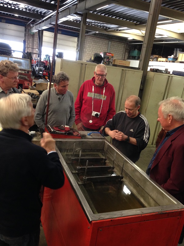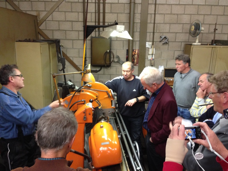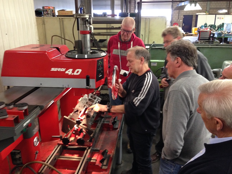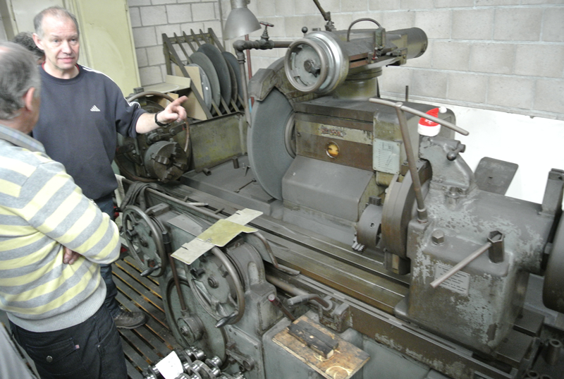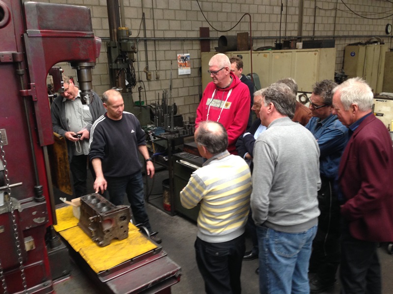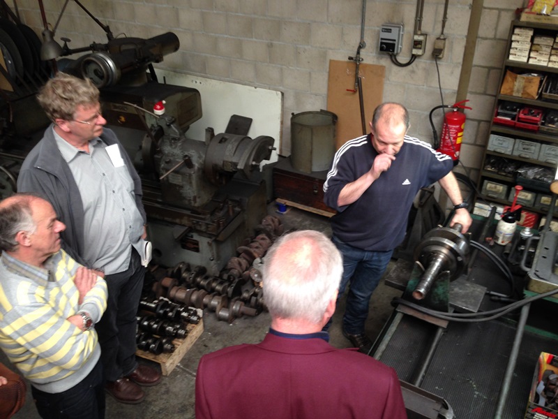 In de volgende gedeelte van de loods demonstreert Ge ons hoe de kop weer optimaal gaat functioneren. Kleppen slijpen, klepzittingen frezen geleide bussen zetten en vooral wanneer dat het goed is. Door naar de krukas slijp afdeling waar ons uitgelegd wordt hoe deze geslepen wordt. Lager schalen passeren de revue en steeds weer opnieuw vragen en opmerkingen uit het publiek. Ook liet Ge ons zien hoe ze constateren dat er een scheurtje in de krukas zit met een mooie opstelling van een Hanomag 1 cilinder (magnetisch veld en een flux). De klant zal nu worden uitgenodigd om te komen kijken. Er zal een besluit genomen moeten worden wat te doen. Verder met lijn boren en honen. Kruis patroon in de cilinder wordt besproken en overal, overal is meet apparatuur. Als onderdelen niet meer leverbaar zijn, dan maken wij ze hier ter plekke verteld hij ons, al lopende langs een draaibank. De rondleiding wordt na ruim 2,5 uur afgesloten in de laatste kamer waar ook dieselpompen worden gereviseerd en afgesteld.