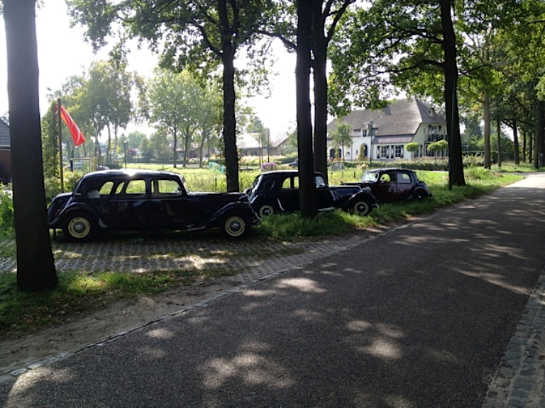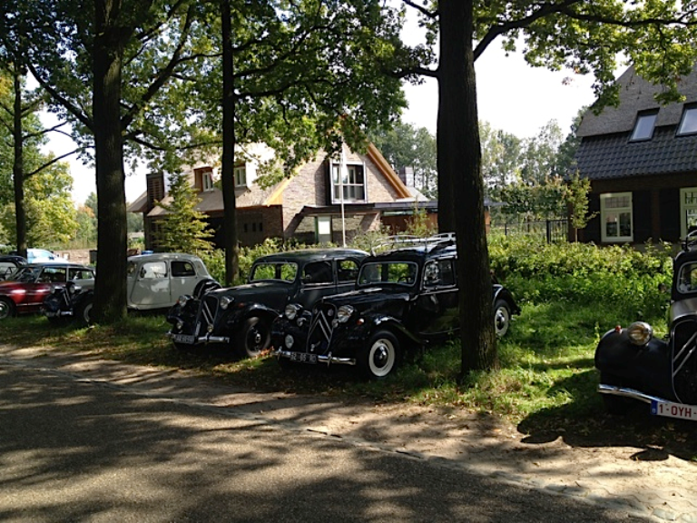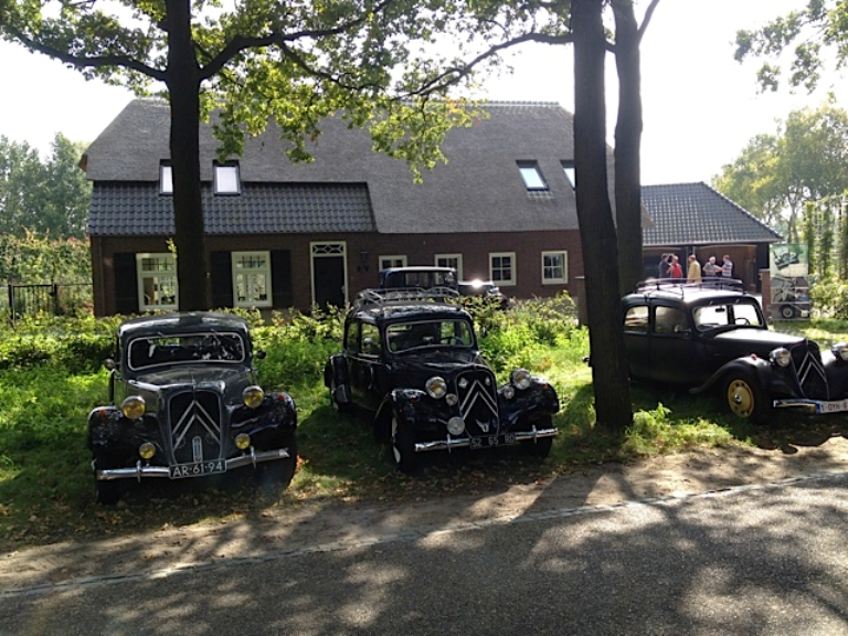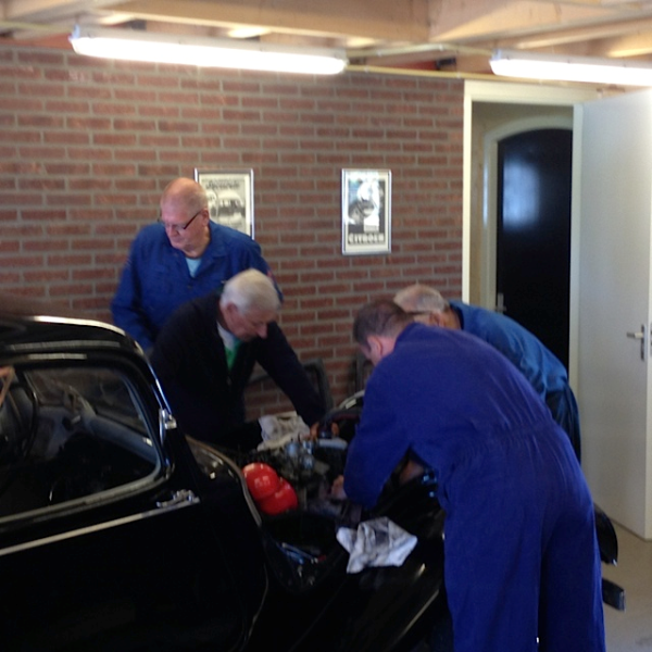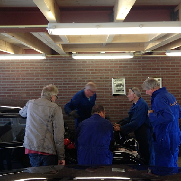 Chris had zijn fietspomp opstelling meegenomen en ook Paul had zijn apparaatje meegenomen waarmee hij zonder hulp de remmen ontlucht. We hebben het bij het aanschouwend onderwijs gelaten. Er stond wel een Traction op de prachtige “’smeerput”’ in de garage van Marc, maar dat was om de smeerpunten nog eens duidelijk te laten zien. Theo Baijens heeft een Legere met Suspension Gregoire op de achteras. Het werd na wat geredeneer duidelijk voor Theo hoe die nu eigenlijk werkt, en dat ook dit deel gesmeerd moet worden. Door de voorspanning op de achteras van dit mechaniek veert de auto soepeler in bij drempels.