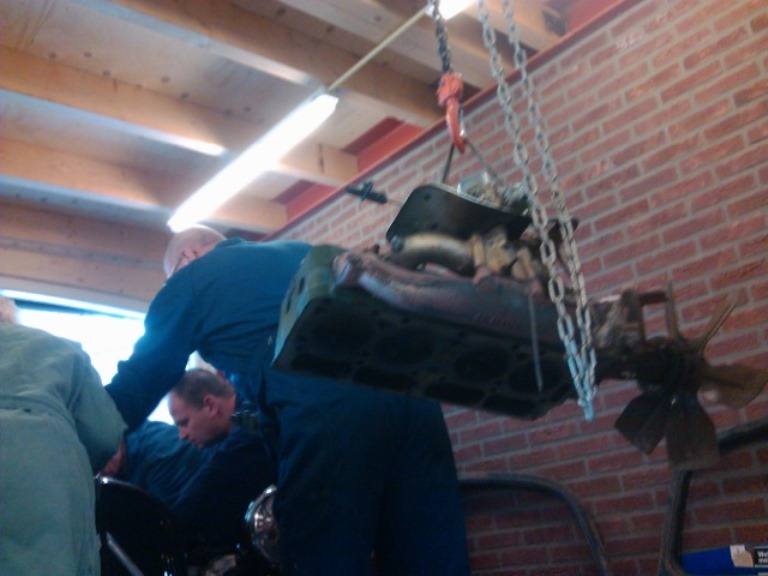 Huib en Henk extra uitgeslapen, goede hulp van Frank Kok met Arendonkse humor, Rene Methorst met onderdelen en velen met goede moed aan het werk. Ik zag vier overalls in, op en onder de Traction, en voordat het tweede kopje koffie genuttigd werd, was de kop eraf (letterlijk en figuurlijk). De kop hing in de gemodificeerde takelinstallatie van Marc en we keken naar de drie plekken waar de koppakking lekte. Na het knikken naar elkaar, de oude pakking eraf en gekeken of de cilinderbussen iets bovenuit staken. Nee dus, maar om de hele motor te demonteren, was geen optie.