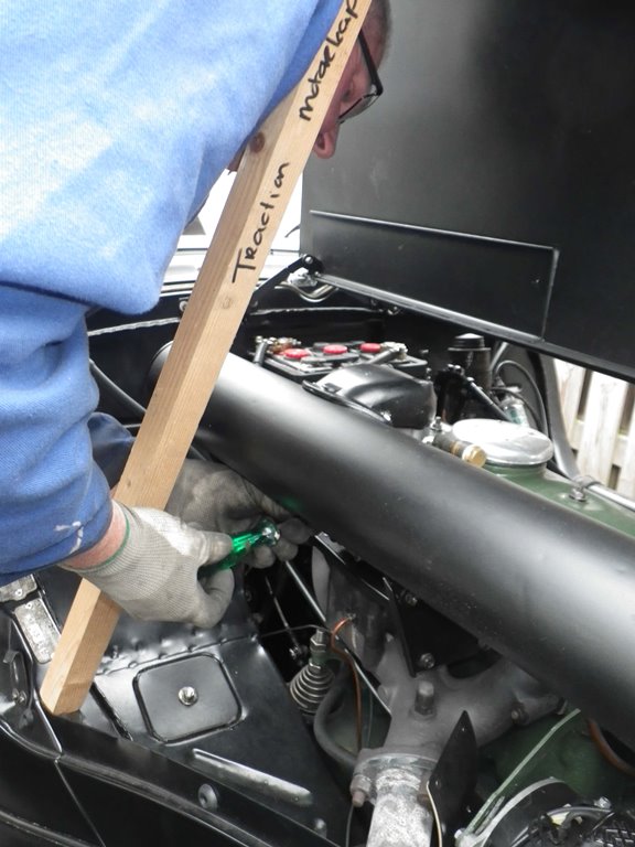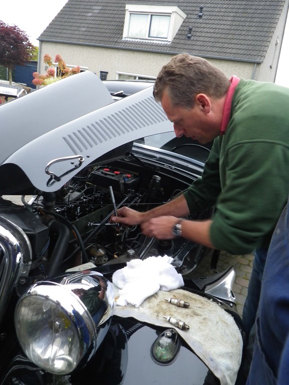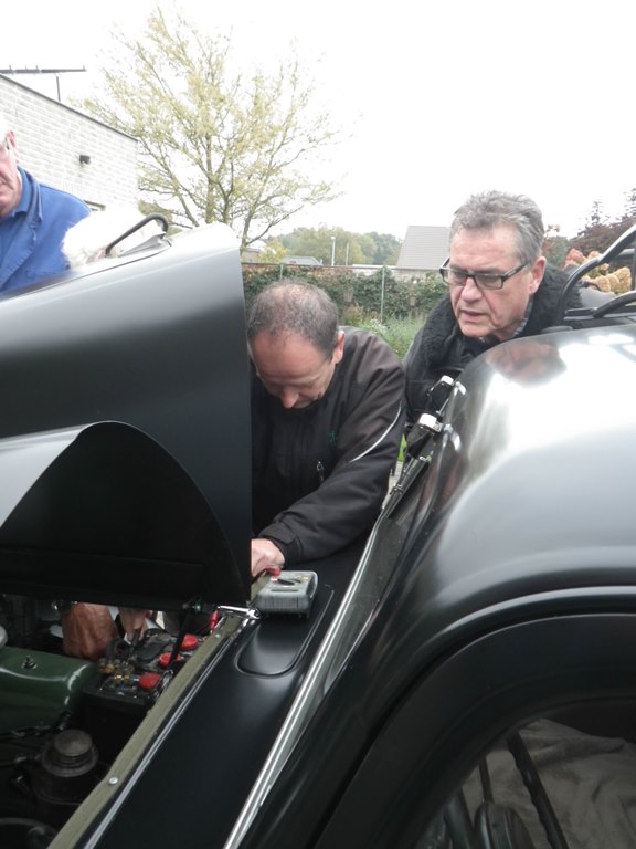 Wij (Frank en Francis) wilden onze auto ook wel even aan de experts tonen en de aftellingen fine-tunen. De afstellingen hebben wij tot nu toe vooral zelf gedaan door gewoon gezond boeren verstand te gebruiken en vooral goed te luisteren naar het motorgeluid. Al snel kregen we te horen dat we het goed hadden afgesteld en mocht ik enkel een kwart slagje geven aan de stelschroeven op de carburateur. Daarna keken we nog even samen enkele rariteiten op onze auto. De vacuümvervroeging kreeg veel bekijks en natuurlijk ook de dynamo, die is uitgevoerd met een derde borstel. Dit houdt in dat je de laadstroom kan afstellen en dit werd natuurlijk nog even tot in de perfectie gedaan. Hierna werd ook onze Trax onderworpen aan de onvermijdelijke proefrit. Dit keer was Henk Maas dienstdoend expert. Het motortje, transmissie, remmen en stuurinrichting werken naar volle tevredenheid en uiteraard wilden Henk en ikzelf wel eens weten waartoe onze Trax in staat is. Er werd even een stukje snelweg ingebouwd en laat nu maar eens zien wat je kan. Bij een snelheid van bijna 110 km/uur lieten we het gas los. We hadden nog over maar voor een auto van 76 jaar oud (ja, ja, 1939 is het bouwjaar) vonden we dit meer dan genoeg!