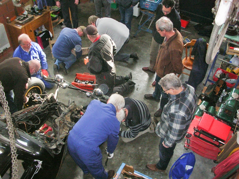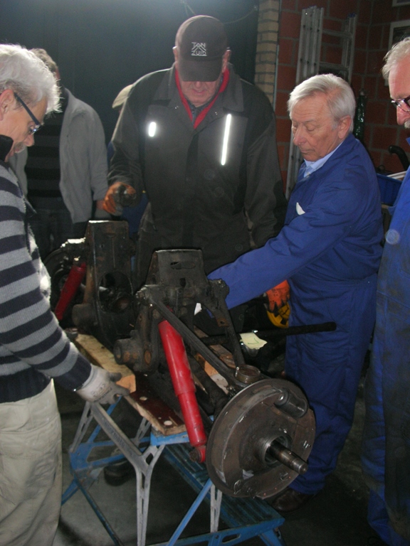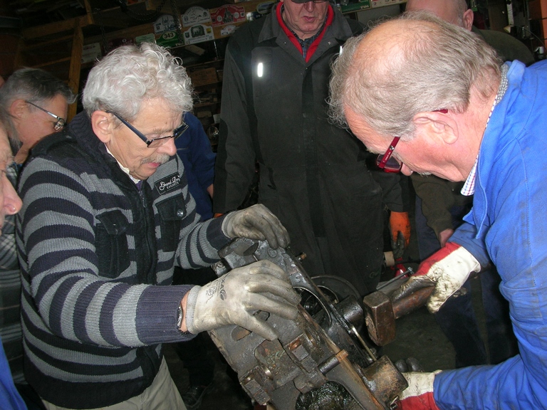 Er werd hard en enthousiast gewerkt, zeker de helft van de aanwezigen hadden de handen goed vuil gemaakt, en er werd soms wel met 6 man tegelijk aan verschillende kanten gewerkt, ondersteund door anderen wat betreft goede raad en het aangeven van gereedschap. De echte experts hadden ook hun eigen specifieke gereedschap mee, vooral de “trekkers” waren zeer zinvol. Soms werd door het enthousiasme ook wat teveel losgemaakt. Voor Paul was het belangrijk om alles wat los kwam goed op tijd te pakken te krijgen om het gesorteerd weg te leggen ter voorkoming van een te grote puzzel achteraf.