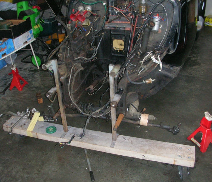 Na ontvangst met koffie en cake zijn we aan de slag gegaan. De Trax stond nog op de wielen maar dat duurde niet lang. De steuntjes kwamen al snel te voorschijn en voordat we het wisten werd de voorkant al gelicht. De motor was er al uit, dus dat zou het wat makkelijker maken. Bumper eraf, wielen er af, remtrommels eraf maar dan de spoorstangen. Die zaten erg vast! De ene trekker is de andere niet en gelukkig waren er een aantal mensen die ervaring hadden en wisten hoe dit klusje te klaren. De gasbrander heeft daarbij goede dienst gedaan. Na wat draden doorgeknipt te hebben en de 4 moeren, die de travers vast houden aan de traxion, losgedraaid te hebben kwam de voortrein met enig wringen los van de koets. Daarna veel gedemonteerd, alleen de silentbocs zelf en de onderste twee fusee’s waren ondanks vakkundig geweld niet los te krijgen. Hiervoor zal echt een grote pers voor gezocht moeten worden. De koets is nog keurig op een verrijdbare balk geplaatst zodat ook die verplaatsbaar is.