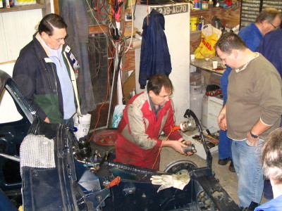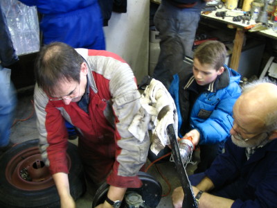 Ploeg Pim ging aan de slag met het linker wiel, en ploeg Frank met het rechtervoorwiel. Ploeg Hans en David was aan de achterkant enthousiast bezig om de boel op te krikken en de remvoeringen te plaatsen.