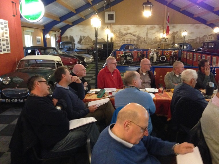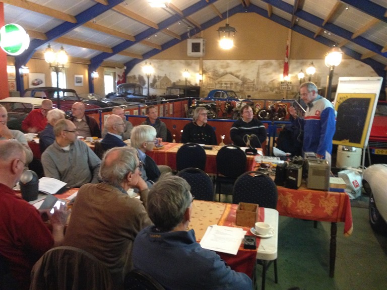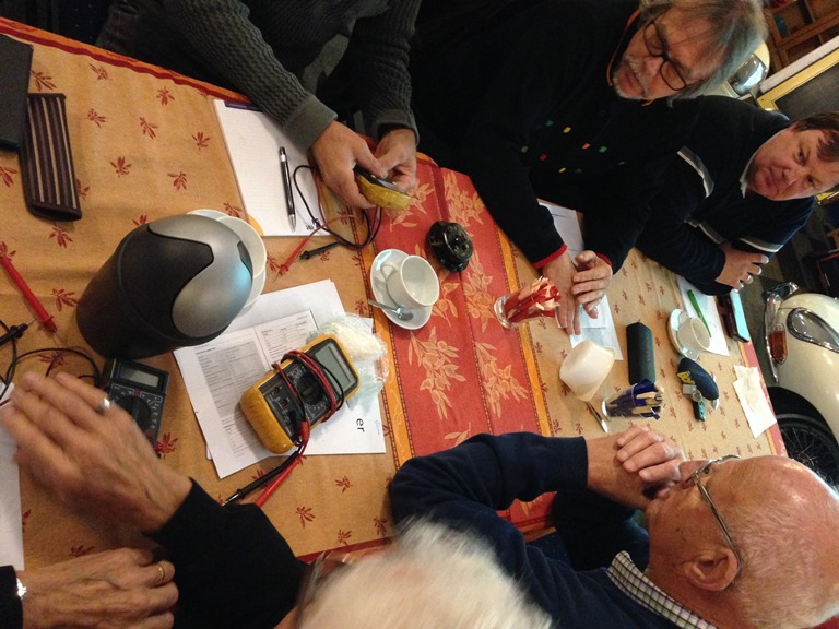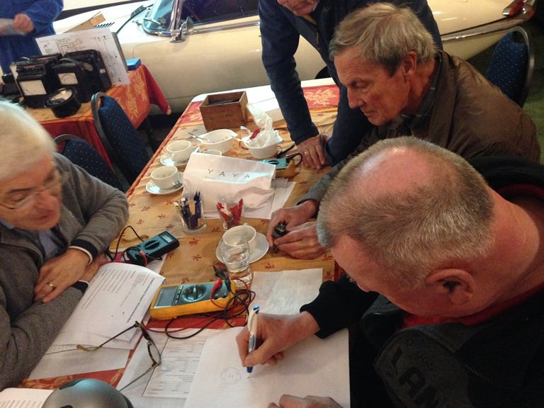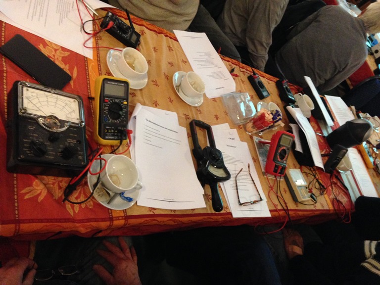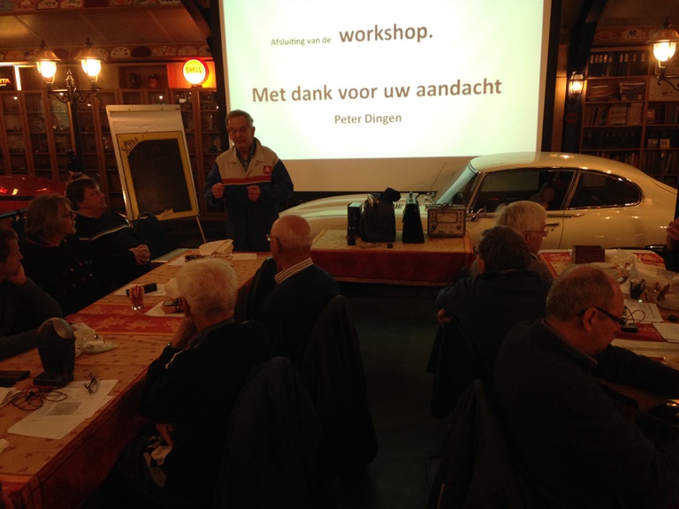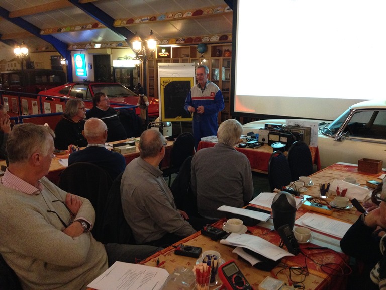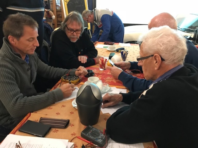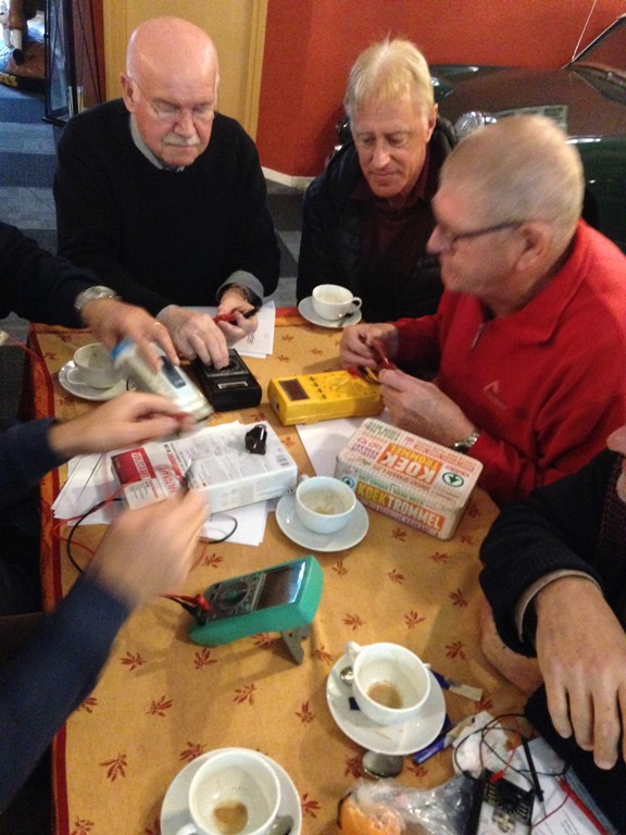 Ook werden, als praktijkoefening, de aanwezigen in groepjes verdeeld om via weerstandmeting te beoordelen wat mis was met voorwerpen als bobine en schakelaars. De resultaten en conclusies van al het gemeet waren redelijk tot goed. We kregen ook de beschikking over een hand-out van de gegeven informatie. Aangevuld met interessante tabellen over stroomwaarden en kabeldikten. Met deze les en hand-out kunnen we nu zelf in de praktijk aan de slag.