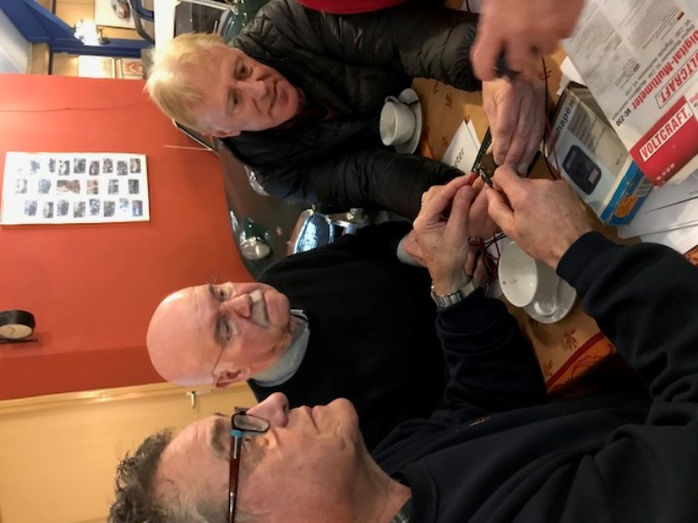 Peter, met behulp van een groot scherm, hield een uitgebreid verhaal over de multimeter in al haar facetten. Meten is weten met als uitgangspunt de bekende Wet van Ohm. Hoe kun je zo’n instrument bedienen, waar moet je op letten, storingen zoeken, veiligheid, meetfouten etc.