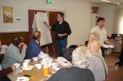 Dit was nog niet alles. Matthijs hield een inleidend verhaal; leuk en begrijpend voor iedereen en en passant leerde hij ons, via de piramide, hoe we de wet van Ohm niet meer kunnen vergeten. Inmiddels met kennis van stroomgestuurde LED’s ipv spanning gestuurde lampjes, aan de slag in vele productiegroepen analoog aan serieproductie-systemen. Geert verzorgde de koffie en de soep. En Jac zijn vrouw had heerlijke taart (40pers) gebakken. Klasse!