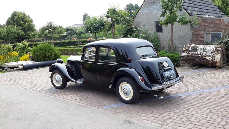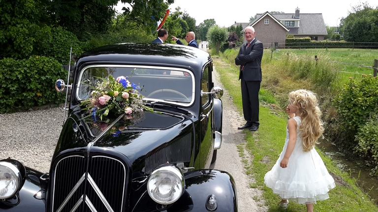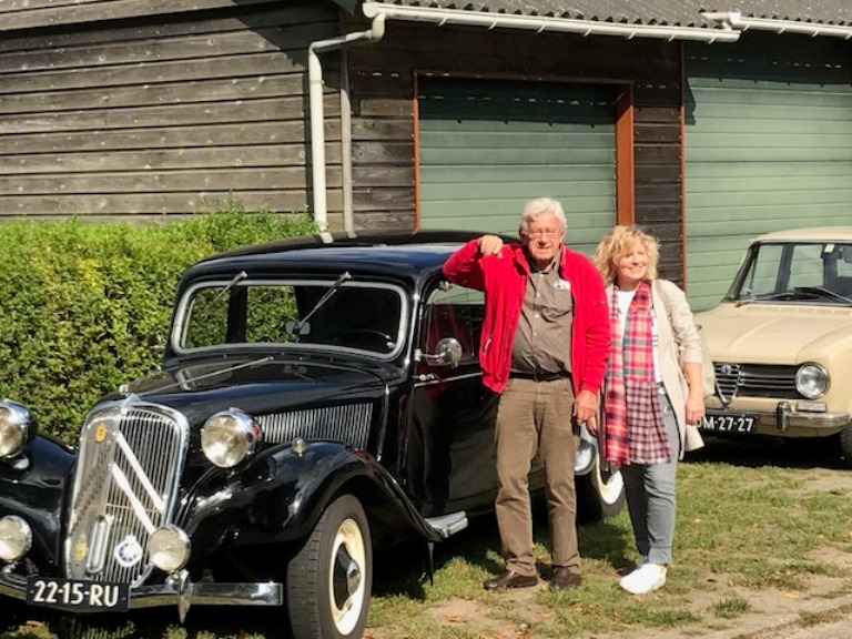 Jan de Haas had als kind van 10 een keer een hele stoet Tractions gezien, en dacht toen: die wil ik later hebben. Hij heeft er regelmatig bij zijn vader aangedrongen, maar dat mocht niet baten. Jan: “Toen ik 45 was besloot ik op zoek te gaan naar een mooie Traction. Mijn zus kende iemand die vroeger een Traction garage had, en die man heeft met mij deze auto gevonden bij het taxibedrijf”. De Traction had hier en daar wel wat butsen opgelopen en Jan heeft dat allemaal weer prachtig hersteld. Ook van de aandrijving, remmen en motor heeft hij het nodige gereviseerd. Tot slot heeft Jan een oude man gevonden die vroeger autobekleder was, en die heeft de Traction weer schitterend bekleed. Als het zomers mooi weer is, neemt Jan de Traction en rijdt door de mooie Betuwe fluitend naar zijn werk. De auto zal in zijn hele leven inmiddels wel meer dan 2 ton hebben gelopen schatten Noud en Jan. Overigens stamt echtgenote Jennie ook uit een Citroën familie, haar vader was concessionaire van het merk, en ze had vroeger een Eend. En jullie raden al wat het volgende project van Jan is: een Eend restaureren, we zagen hem al in zijn garage staan. Jennie: “Twee jaar geleden trouwde ons buurmeisje, en het was voor Jan een hele eer om dit lieve bruidspaar te mogen rijden. In juni van dit jaar volgden mijn zoon en schoondochter, en in augustus trouwden mijn dochter en schoonzoon. Prachtige ritten met de Traction, mooi opgepoetst en tiptop in orde!
