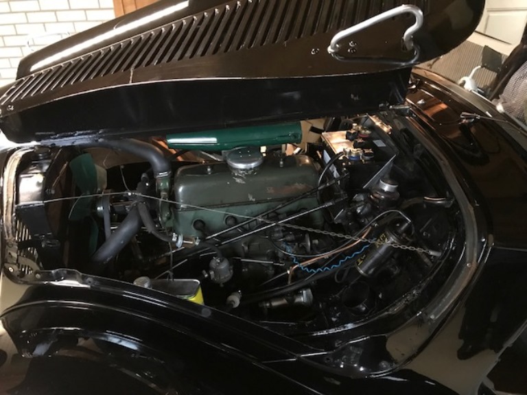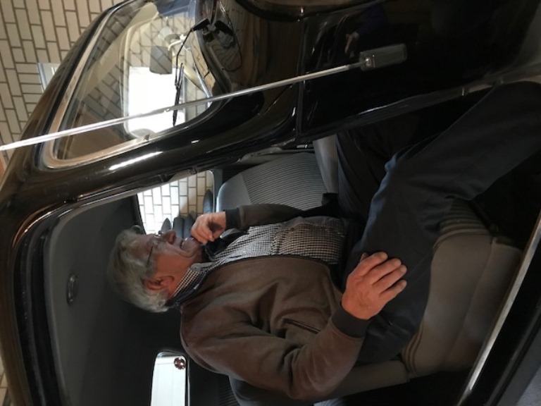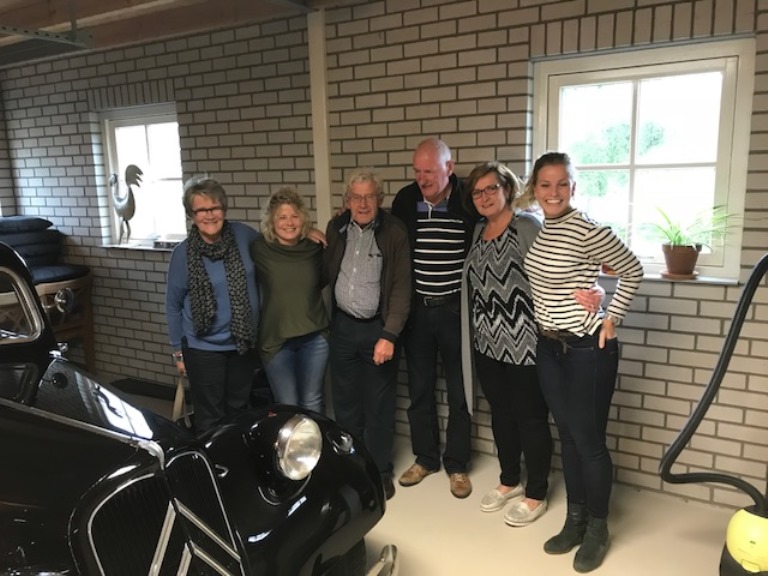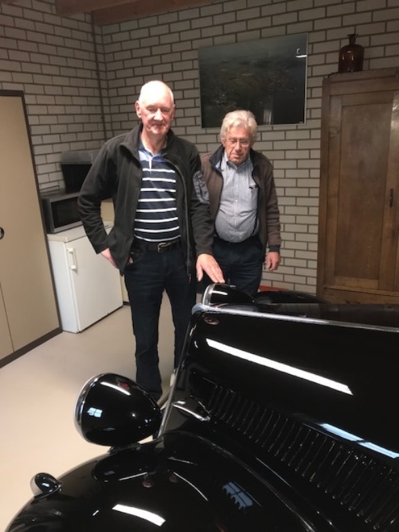 Op een regenachtige zaterdag werden we met een warm welkom ontvangen door Jan en Jennie en hun dochter. Het eerste plechtige moment was de overhandiging van de map met alle aantekeningen en aankoopbewijzen die Noud nog had bewaard. Jan was er maar wat blij mee, dat hij deze historie nu kan inzien. Het tweede mooie moment was het betreden van de garage. De auto is in concours staat en het moment van weerzien voor Noud, Joke en Janneke was fantastisch. Al gauw ging de motorkap open, en werd er plaats genomen in de auto. Alles voelde weer als vanouds, zelfs de sticker op de achterruit zat er nog op. Meteen kwamen er nog meer herinneringen naar boven, en konden Noud en Jan alle technische aanpassingen doornemen die ze hadden gedaan. Ik denk dat er op een mooie voorjaarsdag er nog een leuk ritje wordt gemaakt door deze 2 heren in de prachtige Betuwe.