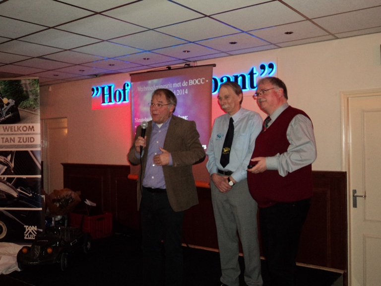 Gedurende de receptie is HET boekje uitgereikt, zijn de bestuurswijzigingen en het boeiende programma voor het komende jaar gepresenteerd. Daarnaast werd onze scheidend penningmeester in het zonnetje gezet.Om een uur of 2 werd de recepte geopend door onze voorzitter. Hij heette iedereen welkom in het bijzonder onze oud leden die speciaal waren uitgenodigd. Deze receptie gaf ons een mooie gelegenheid om ons boekje ‘TAN-Zuid 40 jaar’ te presenteren. De eerste exemplaren werden aan de gebroeders vd Boom, de oprichters van TAN-Zuid, uitgereikt door Marjon Delvaux en Henk Maas. (zie artikel "Jubileumboekje" hoe je dit kunt bestellen). Ook werd de nieuwe banner van TAN-Zuid gepresenteerd welke vanaf nu onze leden welkom zal heten bij de komende evenementen. Daarna was het tijd aan de verschillende organisatoren van de evenementen voor 2014. Te beginnen met Paul Zomers die ons direct enthousiast wist te maken voor de voorjaarsrit (6 april 2014) welke in West-Brabant zal plaats vinden. Middels een boeiende presentatie gaf hij ons al een inkijk wat ons te wachten staat. Hierna was het de beurt aan Paul Officier die ons een presentatie voorschotelde over het ‘TAN 50 jaar’ feest (29 mei t/m 1 juni 2014) wat landelijk op Hemelvaart aan het organiseren is. Voor de mensen die wat low-budget de Hemelvaart willen doorbrengen werd er nog stil gestaan bij het initiatief van de familie Maas en Helbers om de Hemelvaart met de Franse tractionclub in het kader van ‘Traction 80 jaar’ door te brengen in Noord Frankrijk. Uiteraard werd het aspergeweekend (21 en 22 juni 2014) nog eens vermeld om af te sluiten met een korte presentatie van de voorzitter van de BOCC met Rolf vd Zande en mijzelf over de najaar rit / verbroederingsrit met de BOCC (19 oktober 2014) welke op de grens van België en Nederland in het midden van Brabant zal worden gehouden waarbij we ernaar streven om dit een BOCC – TAN-Zuid coproductie te laten zijn waardoor u kunt gaan genieten van vele Tractions met Belgische platen. Ook werd er kort stilgestaan bij de financiële verantwoording van 2013 door de penningmeester. Deze werd hierna uitvoerig toegesproken door de voorzitter omdat hij na 11 jaar als bestuurslid, secretaris, penningmeester en vicevoorzitter nu afscheid nam van het bestuurlijke circuit.