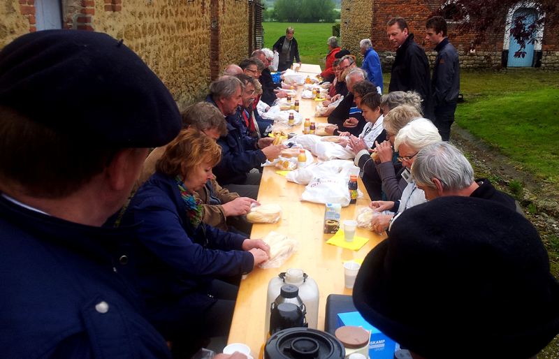 Uitgerust startten we de vrijdag met een individuele rit door het regionale Natuurpark. Een prachtige omgeving met zon maar ook regen. De lunch was op een unieke locatie. Een boerderij uit de zestiende eeuw (Ferme MIONET in Leubringhen) was het decor voor de uitklaptafels, banken en de vele tassen gevuld met, maar vooral voor de uitbundige leden die tussen de buien door droog van de lunchhapjes konden genieten. Paul had daarbij zijn i-pod op een speaker gezet, waardoor de chansons de fantastische sfeer verhoogde. Aan het einde van de lunch bood de Ferme iedereen als verrassing, huisgemaakte boerenijs aan. Dat was echt smullen.