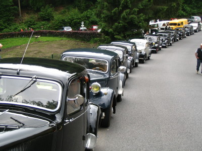's Middags voerde de tocht ons naar het kasteel van Beaufort. Met de hele groep beklommen we de ruïne. Een heuse gevangenis kelder en de martelkamer waren natuurlijk zaken die we even moesten inspecteren. Een echt gruwelkasteel dus. Ondertussen werden tientallen foto's geschoten van de rij met blinkende Tractions die langs de weg geparkeerd stond. Je moet weten dat Hans Schipper 's ochtends zwetend en driftig poetsend zijn best had gedaan om de zijne het meest van allemaal te laten glimmen. Bij een tussenstop bij een rotspartij een eindje verderop werd flink geklauterd, met name door de jeugd. Allen bewonderden Joep Kloth, die ondanks zijn krukken als een atleet snel boven was, en dat terwijl menig ander zich nog zuchtend naar boven werkte!
