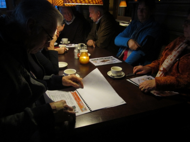 De route voerde ons – naast dwars door het centrum- naar de Bossche ommelanden. Zelfs een deelnemers, die nabij Den Bosch woont en dus de omgeving op zijn duimpje kent, gaf aan dat hij zelfs nog op onbekende plekken was geweest. Er zijn mensen die de fusiladeplaats in Vught hebben bezocht. Een wandeling onder de paraplu was een goede afwisseling, naar verluidt.