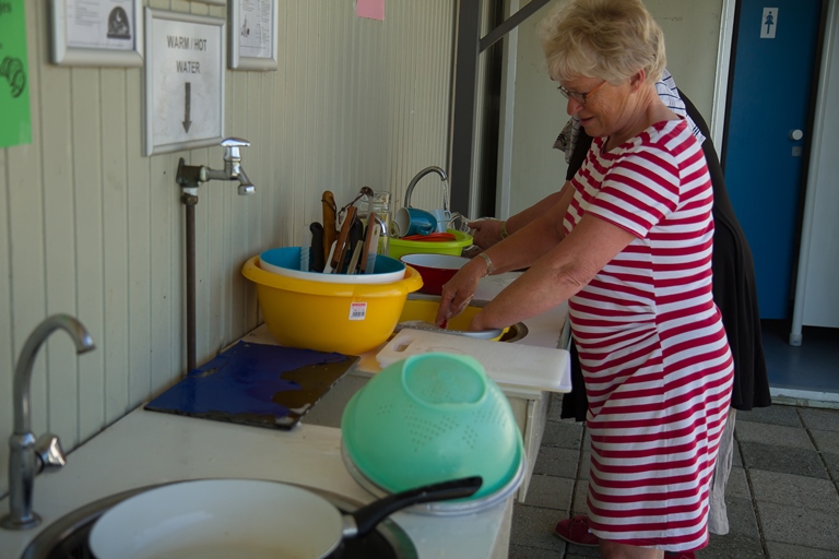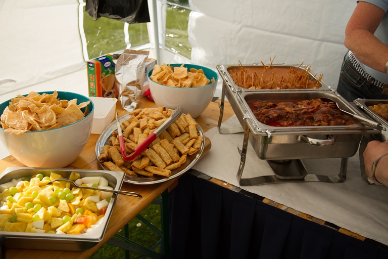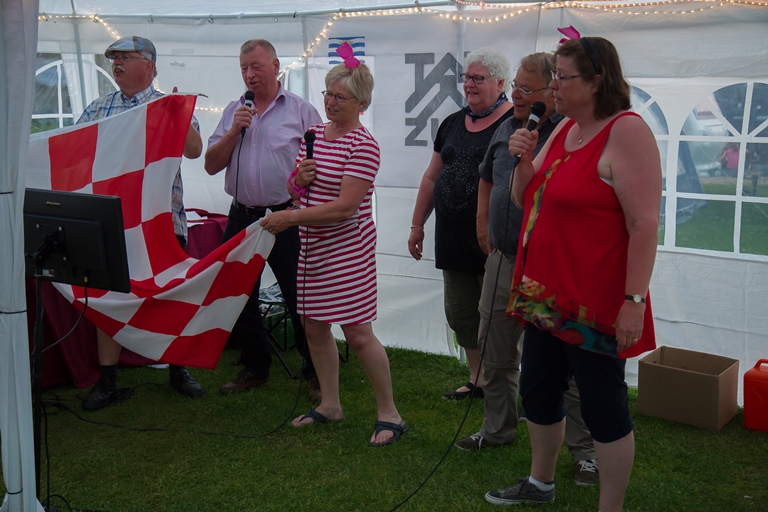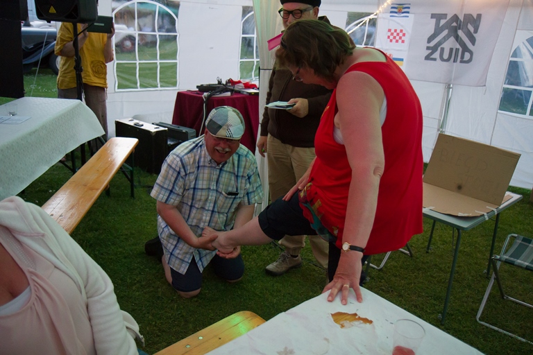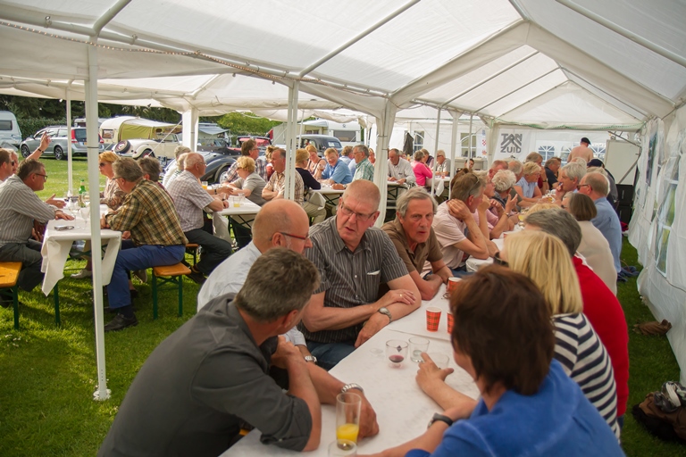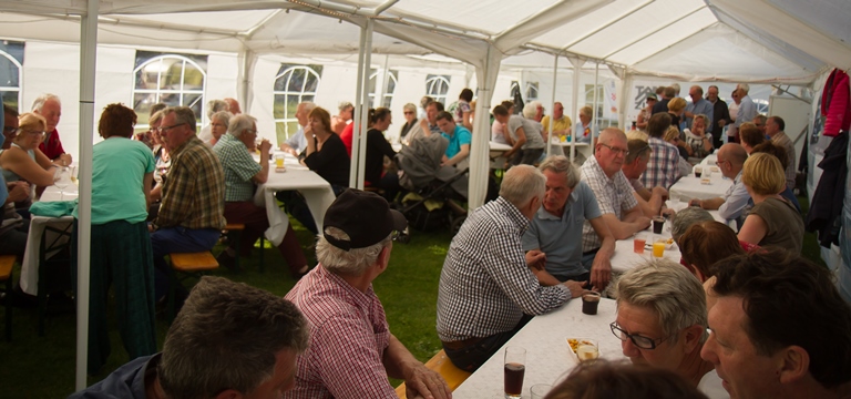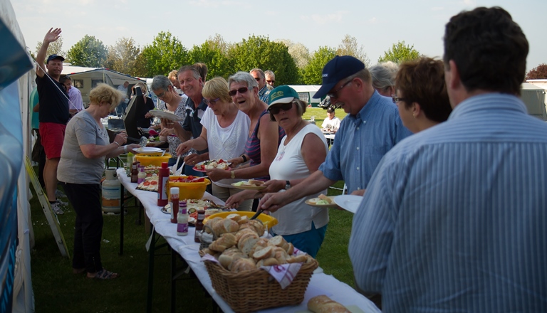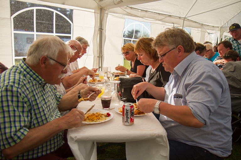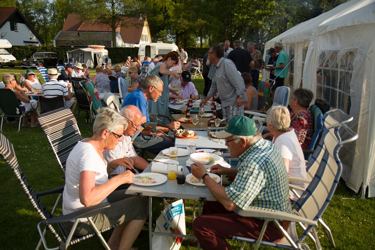 Om 18.00 uur werden we weer verwacht in de tent voor het stamppotbuffet, wat Peen en Uien, Boerenkool en Zuurkool inhield, met worst, speklap en suddervlees. Wederom genoeg en erg lekker zelfs bij 29 graden hitte...