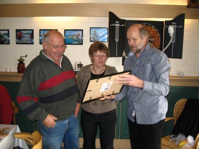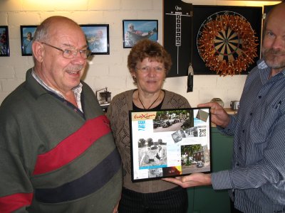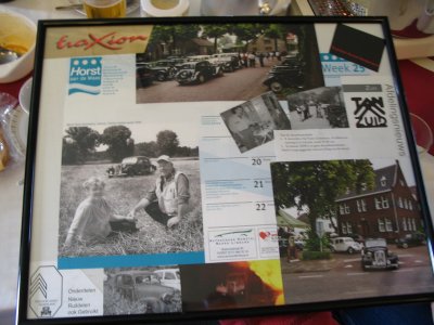 Zoals u wellicht al weet beschikt onze Frans over een prima bar aan huis, zodat we tijdens de lunch met heerlijke soep onze broodjes konden nuttigen en natuurlijk ook een Limburgs pilsje konden drinken. Ria en haar dochter hadden weer hun best gedaan in de keuken! Tot grote verrassing van Frans en Ria kregen ze een collage aangeboden over hun Traction. Hans van den Brandt had in de plaatselijke krant een artikel over Frans gevonden en uitgeknipt, en met de nodige plaatjes van aspergeritten en sleuteldagen omlijst.