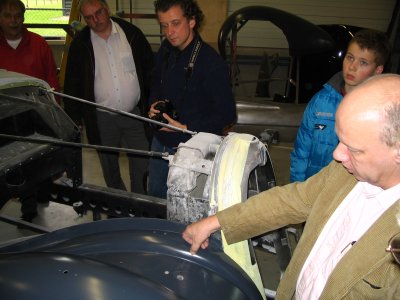 's Middags gingen we naar Grubbenvorst, om daar bij de gebroeders Niessen te kijken naar al het moois dat zij restaureren. We werden hartelijk ontvangen en kregen een rondleiding door het hele bedrijf. Hier worden nog op ambachtelijke wijze oldtimers gerestaureerd. Spatborden van een Aston Martin bijvoorbeeld die worden geklopt uit aluminium met houten hamer op een zandzak. Topstuk dat we konden bezichtigen was een Talbot-Lago T120 uit 1939. Een auto waar maar enkele exemplaren van zijn gemaakt en die helemaal is gestript en weer opgebouwd wordt. Een waar kunstwerkje, waarbij het houtwerk van het frame van de carrosserie nog de meeste hoofdbrekens kostte. Als het meezit gaat deze auto in de zomer van 2008 een mooie prijs winnen op het concours van Pebble Beach in de Verenigde Staten. Aardig detail was ook de versnellingsbak die met pre-select werkt. Je schakelt vast naar de volgende versnelling en via het bedienen de koppeling schakelt de auto pas op of terug.