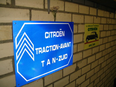 Theo had ook een paar mooie wandversieringen in de garage, zoals een speciaal gemaakt bord met tan-zuid, een oude reclame van de traction en een kalender met een paar dames waarvan eh.. eh... de bekleding nog niet gereed was. In een echte garage mag zoiets natuurlijk niet ontbreken - en met een vleugje Citroën erbij kan het nog net bij dit verslag.
