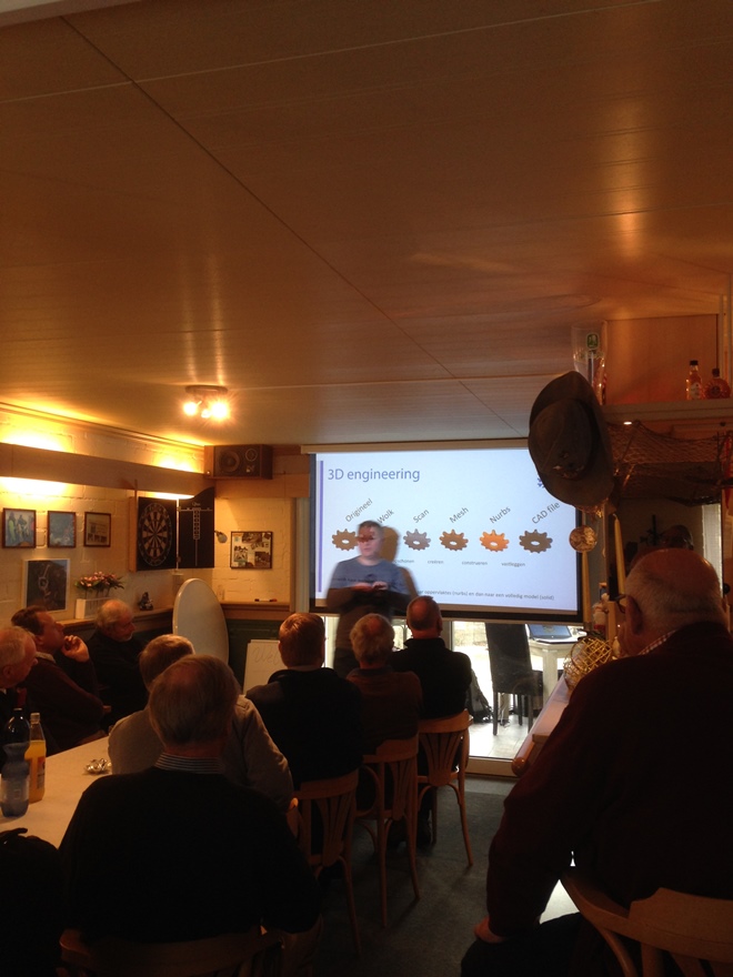In hun gezellige ruimte met bar, volgehangen met foto’s van wonderbaarlijke visvangsten op hun Noorse tripjes, vond een 3D presentatie plaats door de firma Second2New uit Almere. Verzorgd door Michel Veul, Brigitte Gabel en Mike van der Meulen. Met de 3D techniek is het mogelijk om oldtimers "langer op de weg te houden".